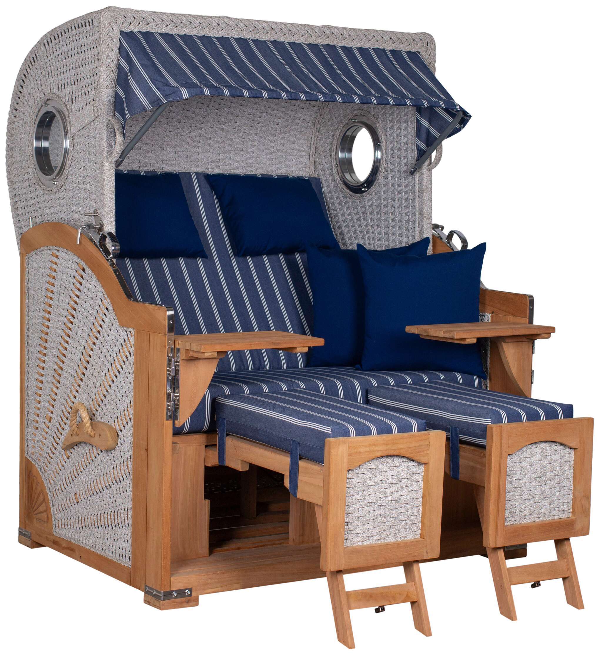Der Strandkorb deVries PURE® Aruba XL Rope 15mm ivory Des. 236 steht für eine gelungene Verbindung aus modernem Design und traditioneller Handarbeit. Das stabile Gestell aus hochwertigem Teak-Holz verleiht dem Strandkorb eine natürliche Eleganz und sorgt für dauerhafte Standfestigkeit im Outdoor-Bereich. Das fein verarbeitete Rope-Geflecht mit 15 mm Stärke in hellem Ivory wirkt leicht und zeitlos, fühlt sich angenehm an und ist zugleich wetterfest sowie pflegeleicht. Verzinkte Beschläge und stilvolle Aluminium-Bullaugen setzen dezente Akzente und unterstreichen die sorgfältige Verarbeitung bis ins kleinste Detail.