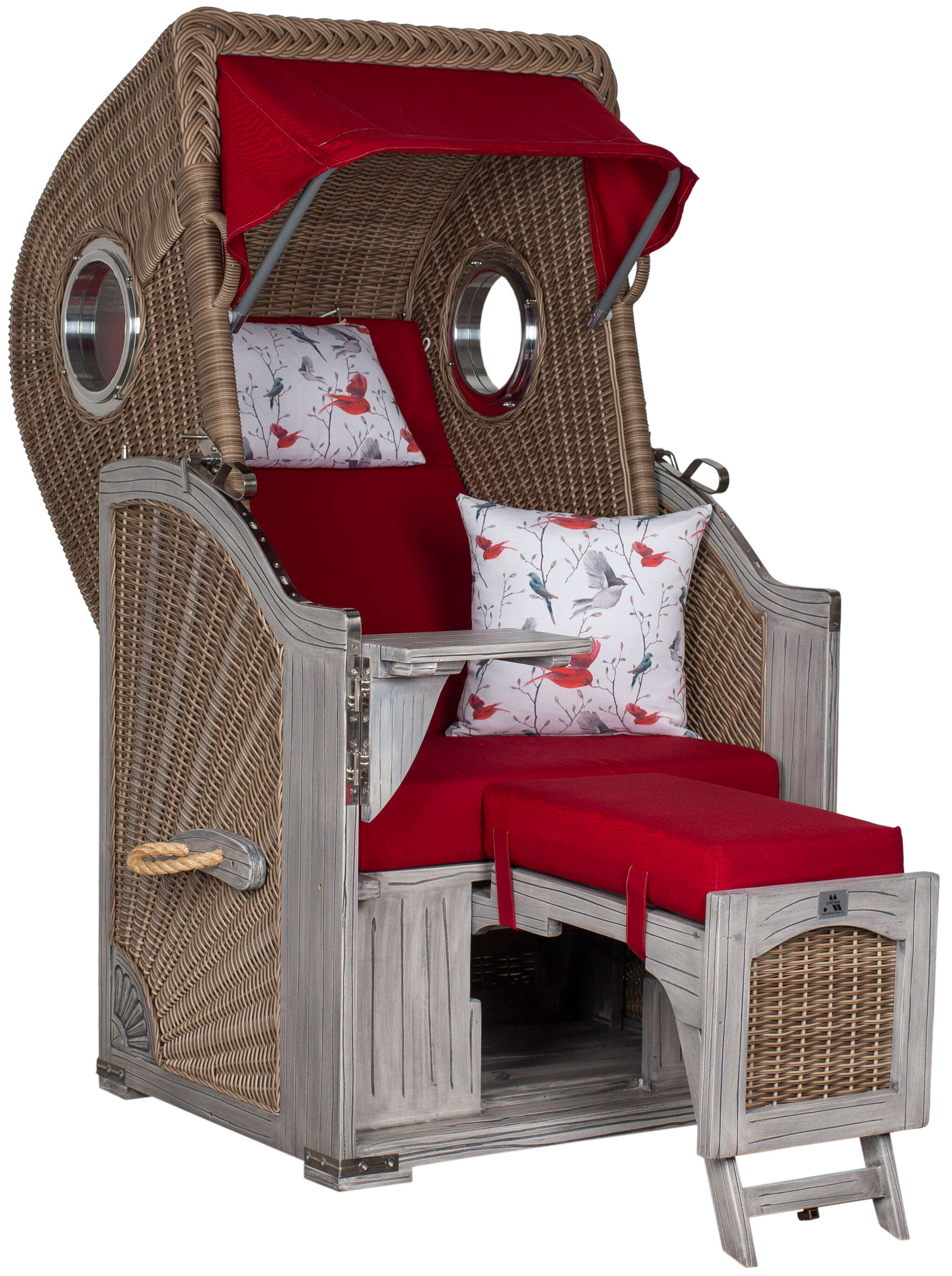 Ein mehrfach verstellbarer Oberkorb sorgt für individuelle Lieblingspositionen, unterstützt durch eine integrierte Rückholfeder für leichtgängige Handhabung. Aluminium-Bullaugen bringen zusätzliches Licht ins Innere und schaffen eine luftige Atmosphäre. Der kleine Cocktailtisch bietet Platz für Erfrischungen oder ein gutes Buch – ideal für entspannte Stunden im Freien. Dank der pflegeleichten und wetterfesten Materialien bleibt der Komfort dauerhaft erhalten, selbst bei wechselhaftem Wetter.