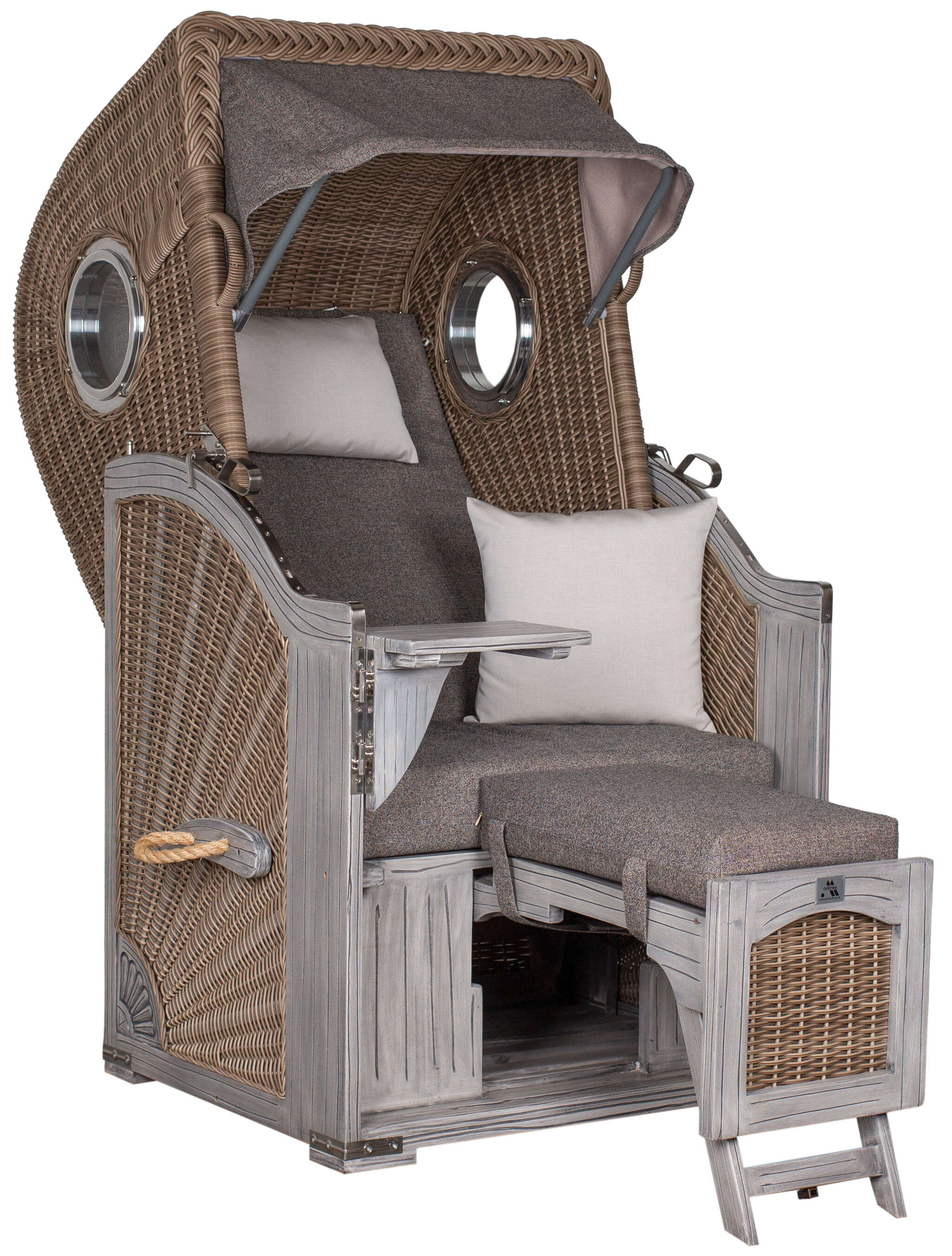 Für maximalen Komfort lässt sich der Oberkorb mehrfach verstellen – sanft unterstützt durch eine integrierte Rückholfeder, die jede Bewegung angenehm leicht macht. Die seitlichen Aluminium-Bullaugen sorgen für Licht und Weite im Innenraum, während der kleine Cocktailtisch praktischen Komfort für Ihre Auszeit bietet. Die verwendeten Materialien sind pflegeleicht und trotzen Wind und Wetter – ideal für entspannte Stunden unter freiem Himmel.