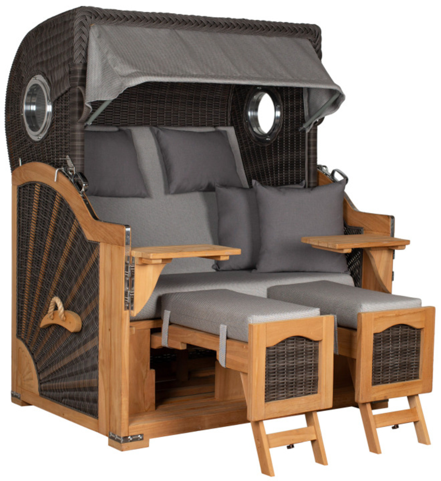 Mit seinem eleganten Design verbindet der Strandkorb deVries PURE® Seemöwe XL PE stone grey Des. 251 zeitlose Schönheit und höchste Handwerkskunst. Das widerstandsfähige Teak-Holz wird durch ein witterungs- und UV-beständiges 6 mm voll PE-Geflecht ergänzt, das nicht nur pflegeleicht, sondern auch besonders langlebig ist. Verzinkte Beschläge garantieren Stabilität, während Aluminium-Bullaugen dem Strandkorb eine moderne Note verleihen. Die großzügigen Maße bieten viel Platz für entspanntes Verweilen.